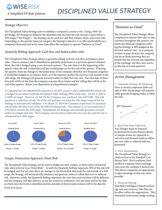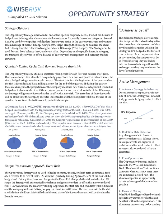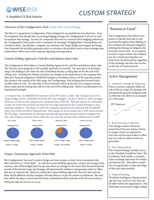 The Custom Strategy uses Wise Risk’s Configuration Tool to let you set your own target hedge percentage, rebalancing range, rolling cycle (monthly, quarterly, or annual), and rate alert thresholds. If you’ve been managing your FX exposure manually with a specific approach in mind, this is how you put it on autopilot without changing your underlying strategy.